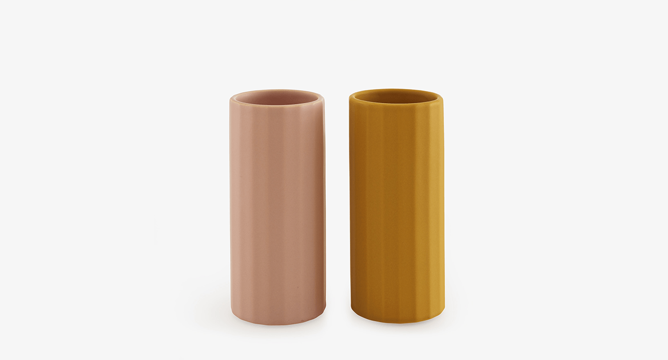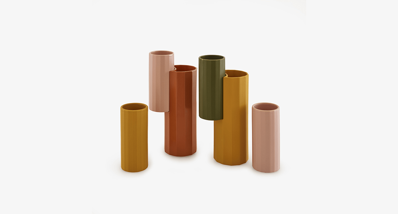 The Dalia vase collection was imagined by Alice Rosignoli as a forest composed of geometric shapes, which would benefit from being staged as a display of several colourful creative pieces. Dalia is currently available in 2 models of enameled earthenware vases, with fluted and cut shapes.
