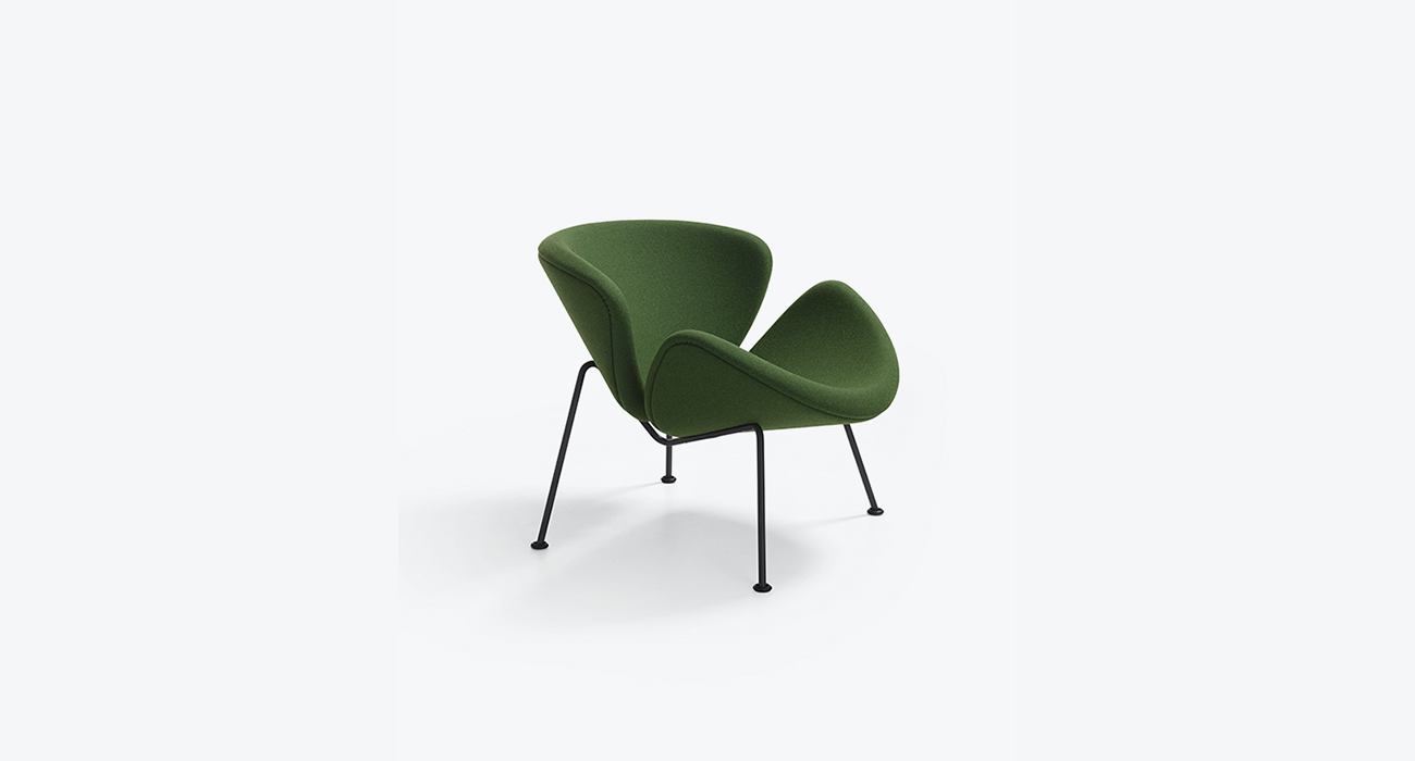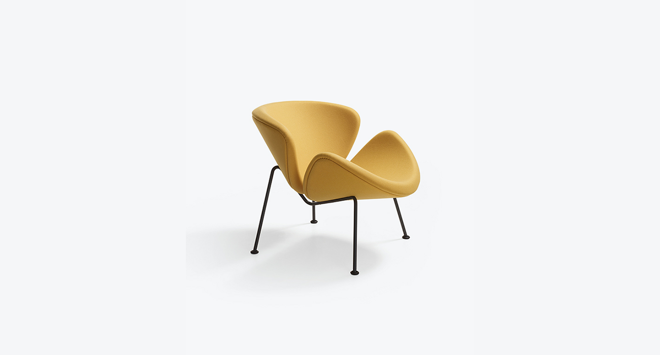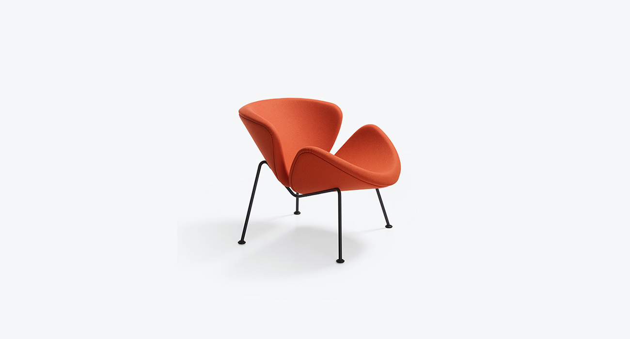 Two identical elements, reminiscent of slices of an orange - one forming the seat and the other the back and armrests - are perched atop an elegant steel frame. A true acclaimed Artifort classic, the Orange Slice® by Pierre Paulin remains highly popular sixty-five years after its creation.